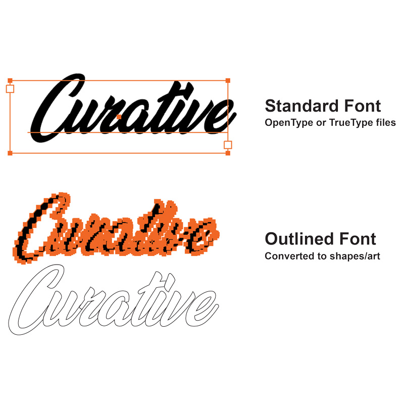It's best practice to outline any fonts in your design before sending to print. Outlining fonts means the text no longer reads and edits as text, but instead identifies as shapes, like artwork. This allows a printer to successfully print your project even if they don't have your chosen fonts on hand. | ||||||||||||||||